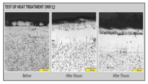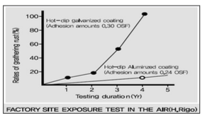 When aluminized product is heated in high temperature for hours the surface of Al layer is thermally diffused and changed into alloy layer then the first. Heat resistance is exerted by alloy layer and the thickness of alloy layer which is diffused can be differentiated by coating thickness at the start, temperature and hours.