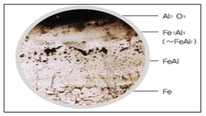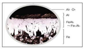 When aluminized product is heated in high temperature for hours the surface of Al layer is thermally diffused and changed into alloy layer then the first. Heat resistance is exerted by alloy layer and the thickness of alloy layer which is diffused can be differentiated by coating thickness at the start, temperature and hours.